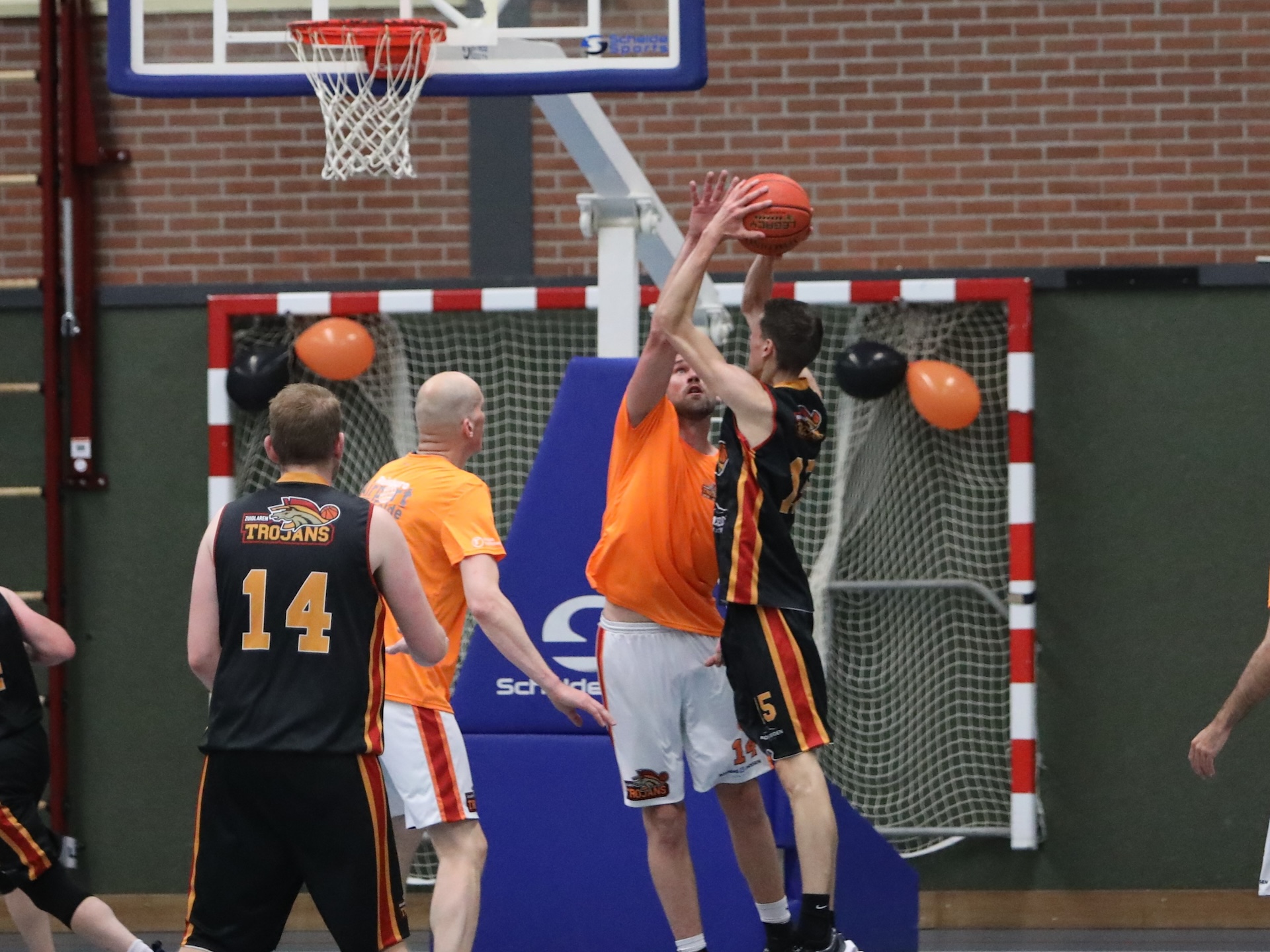 Op voorhand was het een ontzettend ongelijke strijd, maar de heren van Zuidlaren Trojans boden goed weerstand en kwam zelfs op voorsprong bij een stand van 19-18. Uiteindelijk werd ruim verloren met 41-55, maar dat deed er niet toe. Het ging om de show, het basketbalfeest en het goede doel waarvoor men zich inzette. Het bijeengebrachte bedrag van 1000 euro kwam ten goede aan actiegroep Alpe d’HuZuidlaren voor KWF, een doel waar de Zuidlaarder club zich zeer verbonden mee voelt. Vervolgens verplaatste het feest zich naar de kantine van Ritola Korfbal achter De Zwet, waar onder andere Frank Berteling als vice-voorzitter van de Nederlandse Basketball Bond te gast was en de vereniging verraste met een cadeau. Ook de oprichter van de club, Martin Dragtstra, kwam even langs en werd veelvuldig bedankt voor zijn werk 50 jaar geleden, waar nu nog steeds elke week mensen profijt van hebben. Er was een gezellige barbecue, er waren drankjes en een pubquiz. De feestavond duurde dan ook tot in de kleine uurtjes.